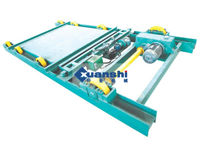 擺渡車是各類蒸養(yǎng)制品廠成型工段連接蒸養(yǎng)工段換向拖動不可少的設(shè)備.該車具有拖動、頂推強(qiáng)勁有力的特點(diǎn).大車橫向快速移動后能夠準(zhǔn)確的停止、定位和接軌,大車載重運(yùn)行時可變頻慢速運(yùn)行,空車回程時可變頻快速。擺渡車上還設(shè)有縱向動力裝置,可以拖動、頂推滿載3噸制品的蒸養(yǎng)小車20輛。