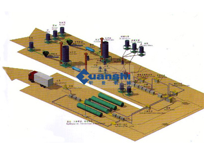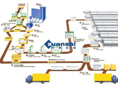 首先將貯存的原材料經(jīng)計(jì)量配料(1)后進(jìn)入澆注攪拌機(jī)內(nèi),經(jīng)攪拌(2)均勻后澆注溫度和時(shí)間的預(yù)養(yǎng)(4)坯體達(dá)到一定硬度后,由翻轉(zhuǎn)吊具把模具和坯體吊至切割機(jī)上。翻轉(zhuǎn)吊具完成下列功能:a把模具在空中作90度翻轉(zhuǎn)(5)(模具的一側(cè)板成為支承坯體的底板直至蒸養(yǎng)出成品),b吊運(yùn)載小車或切割支撐架上完成開模、脫模(6),c脫下的模框和返回的蒸養(yǎng)側(cè)板(16)再重新組合成模具(17)等待清理后噴油(18)重新澆注。坯體在切割機(jī)上分步作六面切割;a首先進(jìn)行坯體兩側(cè)面垂直切割(7),b然后進(jìn)行縱向水平式切割(8);c最后進(jìn)行橫向水平式切割(9)。切割好的坯體由半成品吊具連同底板吊至蒸養(yǎng)小車(10),然后編入蒸壓釜(11)進(jìn)行高溫蒸養(yǎng)(12),蒸養(yǎng)好后出釜(13),由成品吊具將成品堆垛(14)或裝車、打包(15)蒸養(yǎng)側(cè)板則返回。(16)加氣混凝土生產(chǎn)設(shè)備裝備:加氣混凝土生產(chǎn)設(shè)備的選型和數(shù)量根據(jù)工藝設(shè)計(jì)方案而確定,根據(jù)工藝設(shè)計(jì),澆注分為固定式和移動(dòng)式兩種澆注,切割方式目前國內(nèi)以翻轉(zhuǎn)切割為主,其它配料系統(tǒng)、蒸壓養(yǎng)護(hù)等設(shè)備都大同小異。