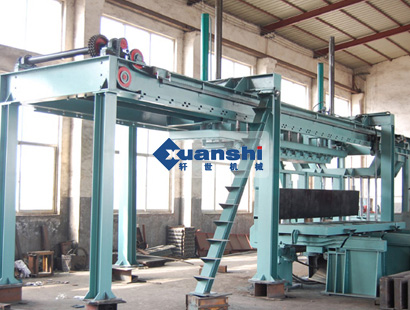 模具內(nèi)預(yù)養(yǎng)好的坯體,由定點(diǎn)行車將加氣混凝土坯體吊到翻轉(zhuǎn)臺(tái)上,脫掉模框,操作控制系統(tǒng), 指令液壓機(jī)構(gòu)將翻轉(zhuǎn)臺(tái)翻轉(zhuǎn)90°,由縱向水平切割機(jī)構(gòu)行走完成切割動(dòng)作,再由橫切機(jī)構(gòu)自上而下擺切割動(dòng)作完成上升到原位完成一次切割周期。