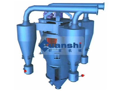 該機(jī)由調(diào)速傳動(dòng)部分、主軸轉(zhuǎn)子部分、分級(jí)圈、旋風(fēng)筒、滴流裝置、殼體、風(fēng)機(jī)等組成,物料由進(jìn)料口落到撒料盤(pán)上,在離心力作用下沿徑向甩出而分散于選粉室內(nèi)與旋轉(zhuǎn)上升氣流相遇,與分級(jí)圈一起高速旋轉(zhuǎn),使氣流中的物料受到較強(qiáng)離心力作用,通過(guò)分級(jí)圈的細(xì)粉經(jīng)旋風(fēng)筒收集落入集灰斗,由下部細(xì)粉口排出,粗粉落到滴流裝置,從粗粉口排出。